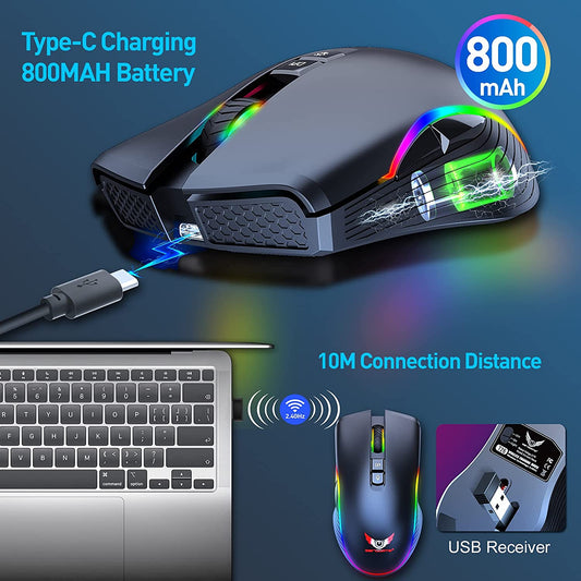 2.4G Wireless Mouse with RGB Backlit 6-Button 3-Speed DPI Type C Rechargeable Ergonomic Honeycomb Design Gaming Mouse